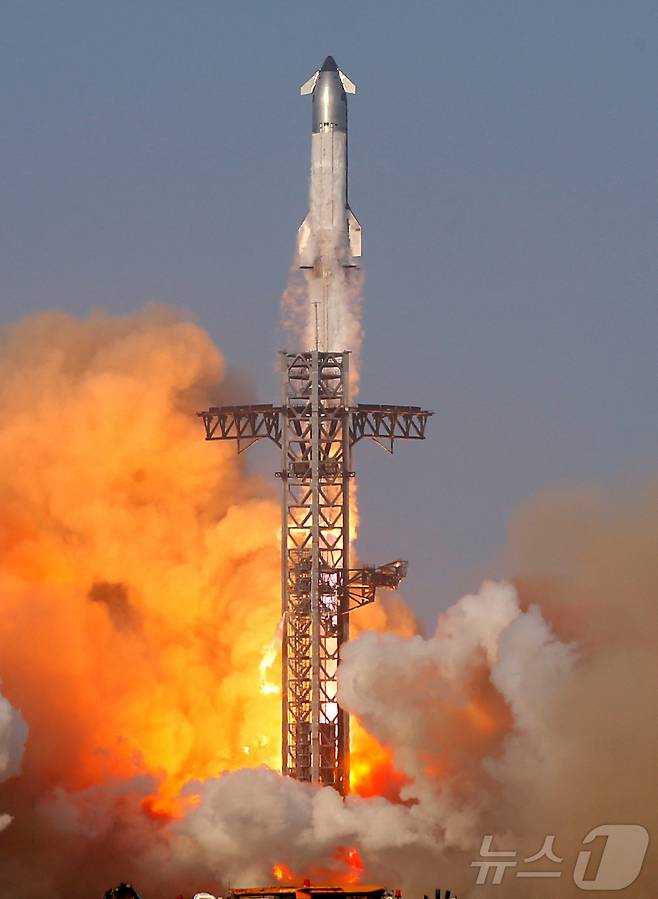 (스타베이스 로이터=뉴스1) 우동명 기자 = 27일(현지시간) 일론 머스크의 우주기업 스페이스X 우주선 스타십이 텍사스주 보카 치카 해변의 스타베이스 기지에서 9번째 시험 발사되고 있다. 2025.05.29