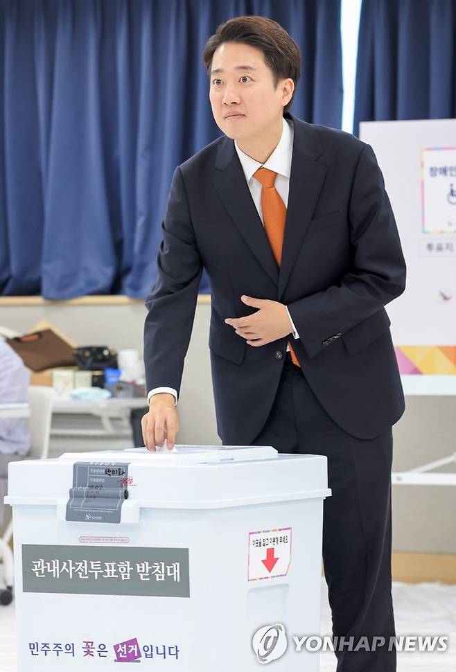 (화성=연합뉴스) 홍기원 기자 = 제21대 대통령선거 사전투표 첫날인 29일 경기도 화성시 동탄9동 행정복지센터에 마련된 투표소에서 개혁신당 이준석 대선후보가 투표하고 있다. 2025.5.29 [공동취재]