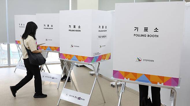 ▲ 제21대 대통령선거 사전투표 첫날인 29일 서울 중구 을지누리센터에 마련된 투표소에서 한 시민이 기표소로 이동하고 있다.