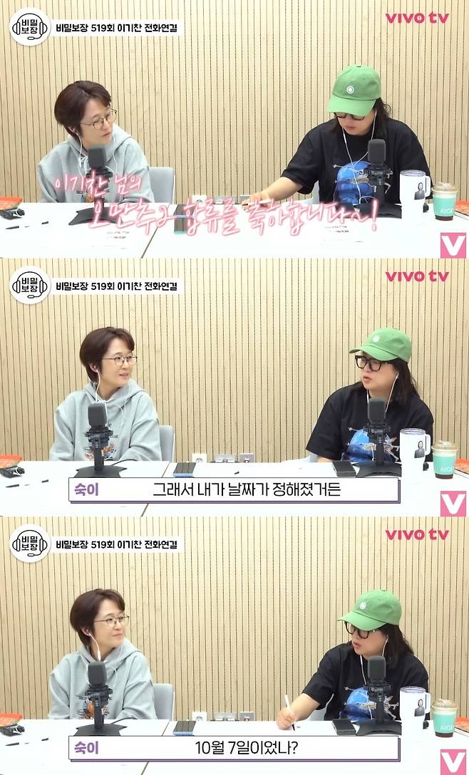 김숙은 이기찬에게 "'오만추2' 너무 부담 갖지 말라. 너도 이제 결혼 날짜 잡아야지"라고 너스레를 떤 뒤 "내가 날짜가 정해졌다. 10월 7일이었나"라고 귀띔해 웃음을 자아냈다.