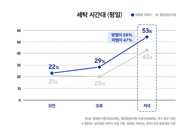 일체형 세탁건조기 구매자들은 평일 오전·오후·저녁 시간 중 저녁에 세탁하는 비중(복수응답)이 절반 이상(53%)을 차지했습니다. 특히 맞벌이 가구는 59%, 외벌이 가구는 47%가 평일 저녁 시간에 세탁한다고 답했습니다.