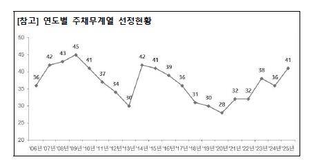금융감독원은 지난해 말 기준 총차입금이 2조4천12억원 이상이고 은행권 신용공여 잔액이 1조4천63억원 이상인 41개 계열기업군을 올해 주채무계열로 선정했다고 29일 밝혔다.