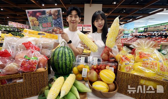[서울=뉴시스] 추상철 기자 = 29일 오전 서울 용산구 이마트 용산점에서 모델이 할인하는 초당옥수수와 과일을 선보이고 있다.