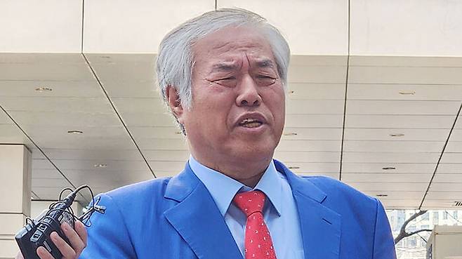 ▲ 전광훈 사랑제일교회 목사가 지난 4월 공직선거법 위반 혐의 관련 재판에 출석, 취재진의 질문에 답하고 있다.