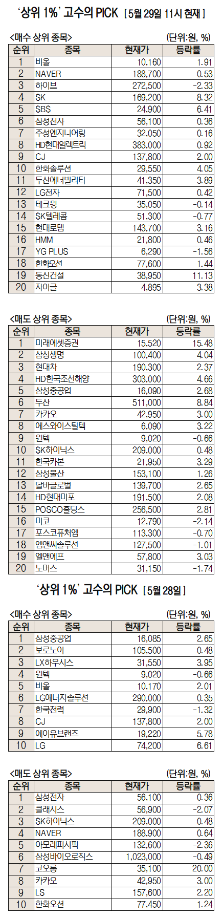 미래에셋증권은 자사 고객 중에서 지난 1개월간 수익률 상위 1% 투자자들의 매매 종목을 집계해 실시간·전일·최근 5일 기준으로 모바일트레이딩시스템(MTS) 상에서 공개하고 있다. 이 통계 데이터는 미래에셋증권의 의견과 무관한 단순 정보 안내이며 각각의 투자자 개인에게 맞는 투자 또는 수익 달성을 보장하지 않는다. 또 테마주 관련종목은 이상 급등락 가능성이 있으므로 유의해야 한다.
