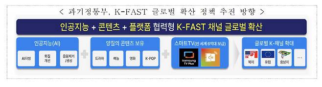 FAST는 광고를 보면 무료로 시청할 수 있는 스트리밍 TV 서비스로 과기정통부는 글로벌 OTT 중심의 미디어 환경 변화와 글로벌 FAST 시장 성장에 대응하기 위해 민관 원팀의 ‘글로벌 K-FAST 얼라이언스’를 발족하고 다양한 지원 사업을 추진 중이다.