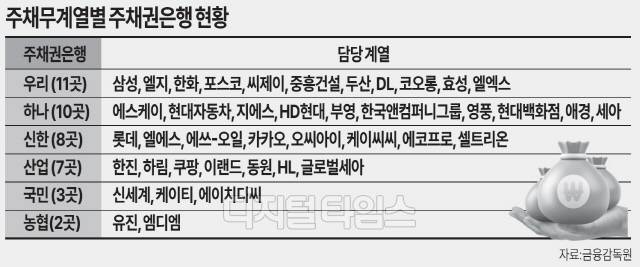 올해 기준 주채권은행은 우리은행이 11곳으로 가장 많았다. 그 다음으로 하나은행(10개), 신한은행(8개), KDB산업은행(7개), KB국민은행(3개), NH농협은행(2개) 순이었다.