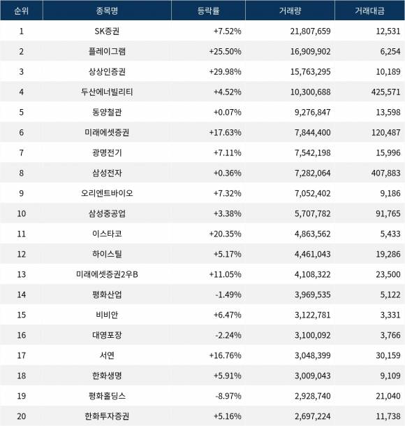 한편 거래량 상위 20위권 종목들은 이스타코(015020) ▲20.35%, 하이스틸(071090) ▲5.17%, 미래에셋증권2우B(00680K) ▲11.05%, 평화산업(090080) ▼1.49%, 비비안(002070) ▲6.47%, 대영포장(014160) ▼2.24%, 서연(007860) ▲16.76%, 한화생명(088350) ▲5.91%, 평화홀딩스(010770) ▼8.97%, 한화투자증권(003530) ▲5.16% 등의 성적을 기록했다.