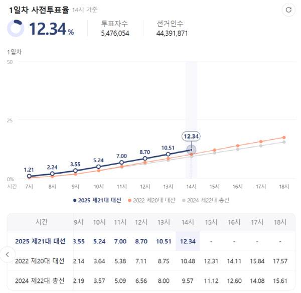 지난 20대 대선 사전투표율은 첫날 오후 2시 기준 10.48%였고, 지난해 22대 총선 당시에는 9.57%였다.