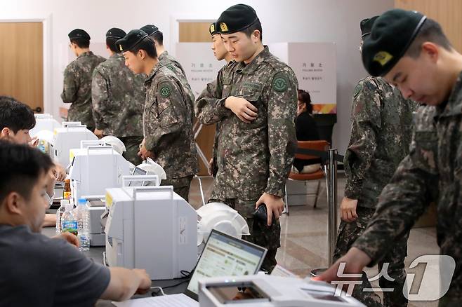 (대구=뉴스1) 공정식 기자 = 제21대 대통령선거 사전투표 첫날인 29일 오후 대구 북구 관음동 어울아트센터에 마련된 사전투표소에서 육군 50사단 장병들이 투표하고 있다. 2025.5.29/뉴스1