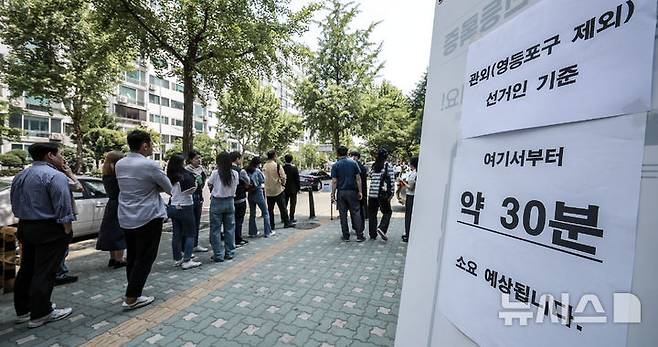 [서울=뉴시스] 정병혁 기자 = 제21대 대통령선거 사전투표 첫 날인 29일 서울 영등포구 여의동주민센터에 설치된 사전투표소를 찾은 유권자들이 투표를 하기 위해 줄 서 있다. 2025.05.29. jhope@newsis.com