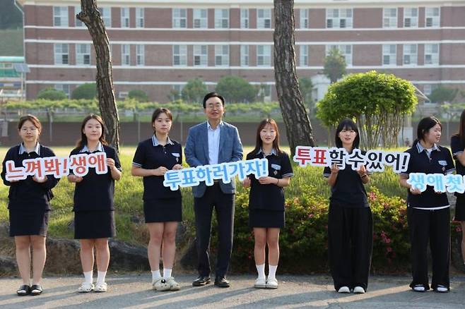 윤병태 나주시장이 제21대 대통령 선거 사전투표 첫날인 29일 남평읍 사전투표소에서 투표를 마친 이후 영산고 학생들의 생애 첫 투표 캠페인을 격려하고 영산포 삼거리에서 1인 사전투표 캠페인을 진행했다.