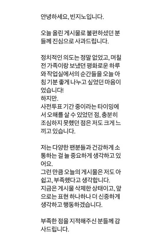 빈지노는 29일 자신의 계정에 "오늘 올린 게시물로 불편하셨던 분들께 사과드린다"며 장문을 올렸다.