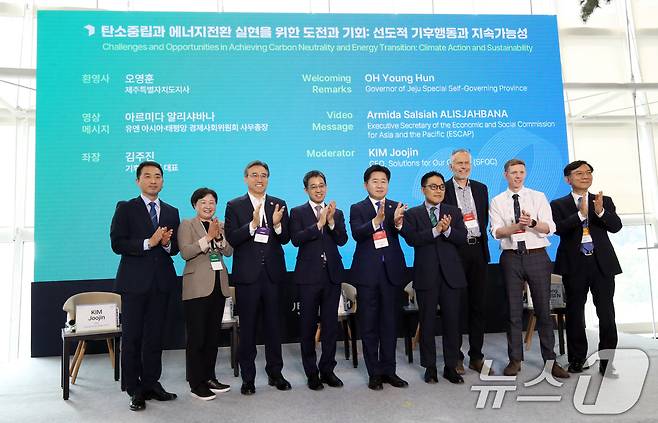 (서귀포=뉴스1) 오현지 기자 = 29일 제주 서귀포시 제주국제컨벤션센터에서 열린 제20회 제주포럼 '탄소중립과 에너지전환 실현을 위한 도전과 기회: 선도적 기후행동과 지속가능성' 세션에서 참석자들이 기념촬영을 하고 있다.