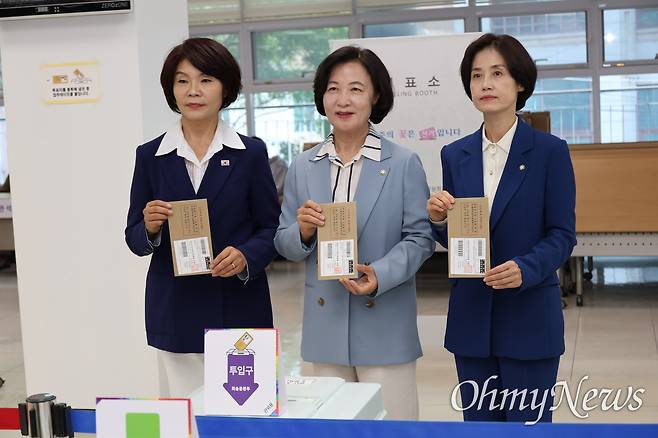 | ▲ 제21대 대선 사전투표 첫 날인 29일 오전 대구 중구 2.28민주운동기념회관에 마련된 사전투표소에서 추미애 더불어민주당 의원과 한정애 전 환경부장관, 박은정 조국혁신당 의원이 사전투표를 하고 있다. |