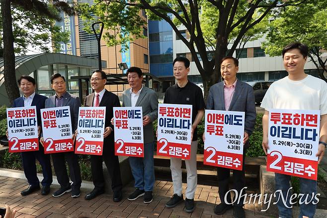 국민의힘 대구 지역구 의원인 주호영, 강대식, 권영진, 김기웅, 김승수, 우재준, 최은석 의원은 이날 오전 9시 수성구 범어1동 사전투표소를 찾아 '투표하면 이깁니다' '이번에도 투표'라고 쓴 피켓을 들고 퍼포먼스를 벌였다.
