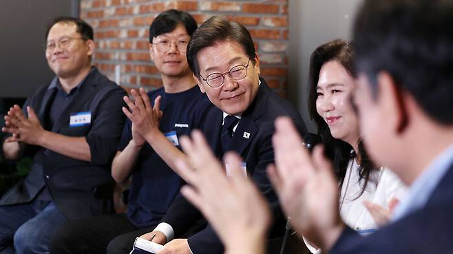 ▲ 더불어민주당 이재명 대선후보가 29일 서울 성동구 메리히어에서 열린 '혁신성장의 씨앗, 스타트업 레벨업!' 간담회에서 소셜 및 스타트업 기업 대표들과 대화하고 있다.