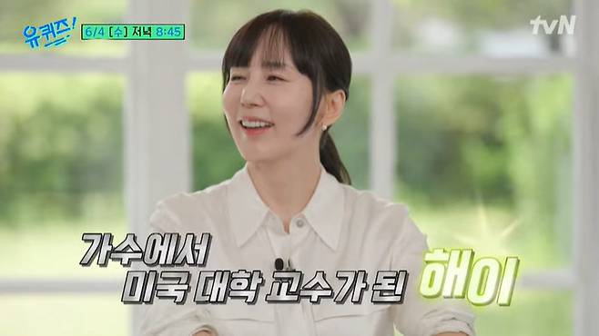[스포츠조선닷컴 이우주 기자] '원조 엄친딸 가수' 해이가 미국 대학 교수로 변신해 '유퀴즈'에 출연한다.