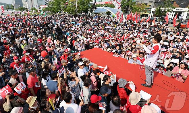 (안산=뉴스1) 김민지 기자 = 김문수 국민의힘 대통령 후보가 제21대 대통령 선거 사전투표 첫날인 29일 경기 안산문화광장에서 유세를 하고 있다. (공동취재) 2025.5.29/뉴스1