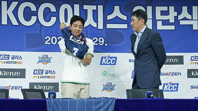 ▲ 부산 KCC 이지스로 이적한 허훈이 29일 서울 강남구 KBL센터에서 열린 입단식에서 이상민 감독으로부터 받은 7번 유니폼을 입고 있다.