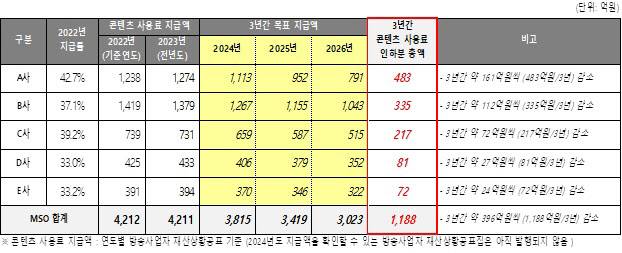 하지만 PP 업계는 콘텐츠사용료를 대폭 감액하겠다는 기준안은 수용하기 어렵다는 입장이다. 기준안에 따르면 5개 MSO 사업자들은 모두 ‘보정옵션’ 적용 대상이 되고 3년간 약 1200억원 규모의 콘텐츠사용료가 감액될 수 있다는 점을 우려하고 있다.