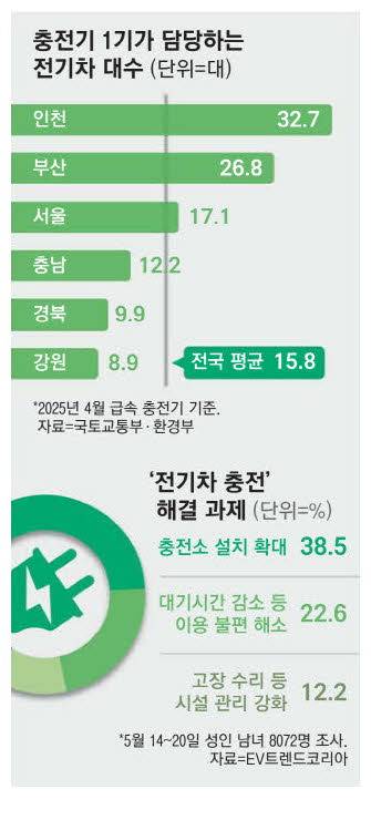 특히 서울을 비롯한 대도시에서는 급속 충전기가 많이 부족한 상황이다. 국토교통부 등에 따르면 급속 충전기 1기가 담당하는 전기차 대수는 지난달 기준 전국 평균 15.8대인데 서울(17.1대), 대전(18.6대), 대구(22.0대), 부산(26.8대), 인천(32.7대) 등 대도시일수록 더 부족한 것으로 나타났다.