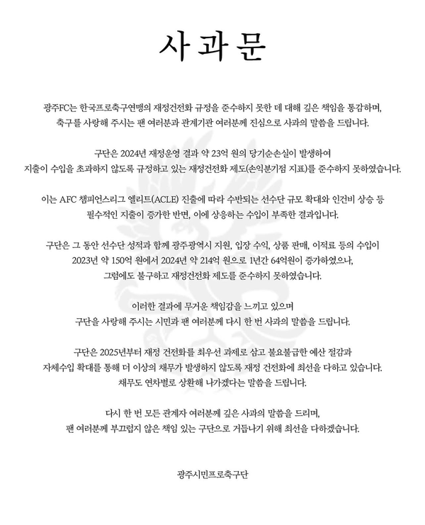 [풋볼리스트] 김희준 기자= 광주FC가 8일 만에 또 다른 사과문을 게재했다. 29일 공식 소셜미디어(SNS)를 통해 "광주는 한국프로축구연맹의 재정건전화 규정을 준수하지 못한 데 대해 깊은 책임을 통감하며, 축구를 사랑해주시는 팬 여러분과 관계기관 여러분께 진심으로 사과의 말씀을 드린다"라고 전했다.