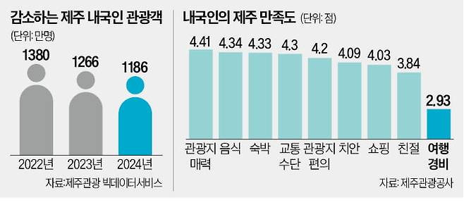 제주가 외면받는 주된 이유로 꼽히는 것이 높은 가격이다. 제주도와 제주관광공사가 3월 말 공개한 실태조사에 따르면 지난해 제주를 방문한 내국인의 항목별 만족도 가운데 ‘여행 경비’ 점수가 가장 낮았다.