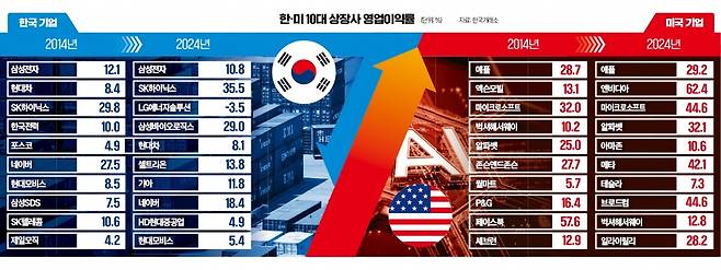 하지만 수익성을 놓고 보면 정반대 결과가 나온다. 지난해 한국 10대 기업의 영업이익률 평균값은 13.4%로 미국 평균(31.4%)의 절반에 그쳤다. 격차는 2014년 10.5%포인트에서 지난해 18%포인트로 커졌다.