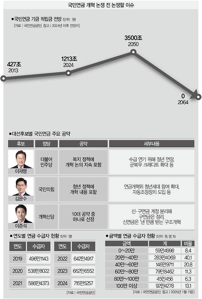지난 3월 국민연금법 개정안이 국회를 통과했다. 보험료율을 내년부터 2033년까지 현행 9%에서 13%로 올리고(세대간 차등), 2028년 40%까지 내려갈 소득대체율을 내년부터 43%(올해 41.5%)로 유지하는 게 개정의 골자였다. 청년층은 "왜 우리가 손해 봐야 하는가" "국민연금을 폐지해야 한다" 등 격한 반응을 내놨고, 6ㆍ3 대선 정국에서도 '연금 개혁론'이 화두로 떠올랐다. 말 많고 탈 많은 국민연금, 우리가 논쟁해야 할 건 무엇일까. 6ㆍ3 대선 에디션 공약논쟁前 국민연금 편이다.