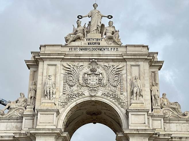 이 길을 내려가 콤메르시우 광장에 들어서려면 아우구스타 개선문을 지나야 한다. 승리의 아치라 불리는 흰색 대리석 구조물 위에 영광, 창의성, 용기를 상징하는 조소상이 앉거나 서 있다. 그 아래 벽면에는 포르투갈의 국민 영웅 비리아투(Viriato), 누노(Nuno Álvares Pereira), 바스쿠 다가마, 퐁발 후작이 부조되어 있다. 비리아투는 『루수스의 자식들』에 나오는 민족지도자로, 기원전 2세기 로마의 공격에 맞서 싸운 최초의 포르투갈 영웅이다. 누노는 주앙 1세와 함께 카스티야 레온 왕국과 싸워 포르투갈의 독립을 이끌어낸 위대한 장군이다.