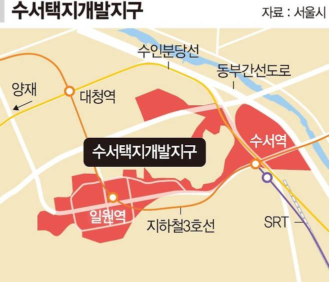 서울 강남구 일대 수서택지개발지구는 남측으로 대모산, 북측과 동측으로는 광수산과 탄천이 위치해 자연경관이 우수한 지역이다. 또 수서역을 중심으로 밤고개로·광평로 등 주요 간선도로가 연결되고 지하철 3호선, 수인분당선, GTX-A, SRT 등 편리한 교통망을 갖추고 있다.