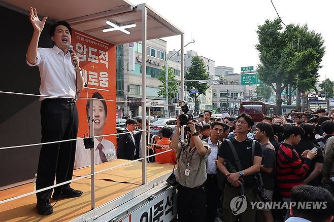 (서울=연합뉴스) 임화영 기자 = 개혁신당 이준석 대선 후보가 제21대 대통령선거 사전투표 첫날인 29일 서울 성북구 안암역 인근에서 열린 유세에서 지지를 호소하고 있다. 2025.5.29