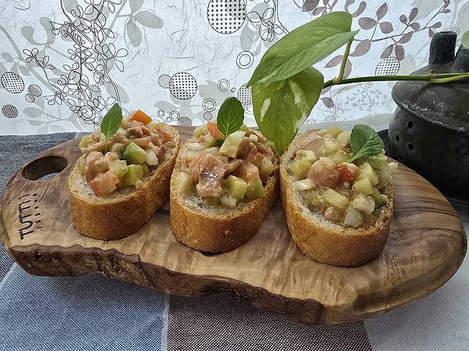 멜론 200g, 연어살 100g, 프렌치빵 4쪽, 토마토 1개, 양파 50g, 마늘 3개, 파마산 치즈 2큰술