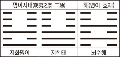 본괘 ‘명이’(明夷)의 괘사에 ‘명입지중(明入地中) 명이(明夷)’라 했으니 이는 어두운 세상의 괴로움에 울게 되는 신세라는 의미로 노인의 현재 상황을 표시한 것으로 본다.