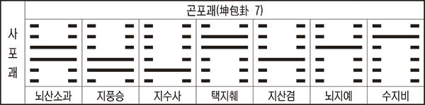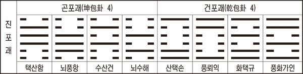 포괘라고 하는 것은 곤위지 또는 건위천괘 속에 다른 7괘의 하나를 싸고 있는 괘를 말하는 것으로, 곤위지 속에 건(乾)을 싸안고 있는 택산함, 뇌풍항, 이(離)를 포함한 수산건, 뇌수해 등이며, 또한 건위천 속에 곤(坤)을 포함하고 있는 산택손, 풍뢰익, 감(坎)을 내포한 화택규, 풍화가인 등 8괘를 진포괘(眞包卦)라 말한다.