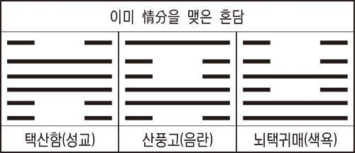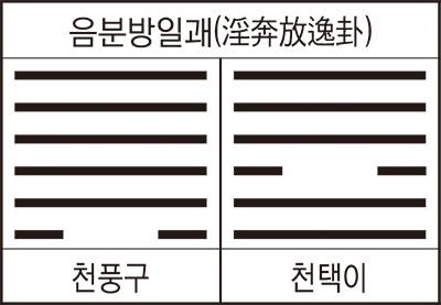 그것은 ‘천풍구’(天風姤)는 여자 혼자서(一陰) 다섯 명의 남자(五陽)를 상대하는 여왕벌의 모습이고, ‘천택이’(天澤履)는 삼효에서 여자의 음부(陰部)를 보여줘 여자의 나신(裸身)의 모습을 하고 있기 때문이다.