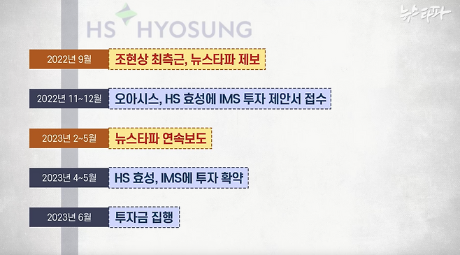 조현상 회장의 비리에 대한 뉴스타파의 연속보도가 나간 건 23년 2월에서 5월 사이, HS효성이 아이엠에스에 대한 투자를 확약한 건 4월에서 5월 사이다. 그리고 HS효성이 IMS에 대한 투자금을 집행한 건 23년 6월 말이다.