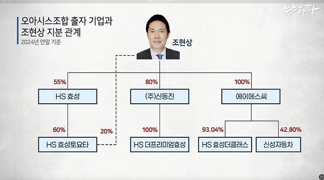 우선 각각 10억 원을 낸 더 클래스 효성과 신성자동차, 모두 에이에스씨라는 회사의 지배를 받고 있었다. 에이에스씨는 고 조석래 회장의 삼남이자 현 HS효성 회장인 조현상 씨가 지분 100%를 갖고 있는 개인 회사다. 5억 원을 투자한 더프리미엄 효성은 신동진이라는 회사의 자회사인데, 신동진은 역시 조현상 씨가 지분 80%를 갖고 있다. 마지막으로 10억 원을 투자한 효성 도요타는 투자 당시에는 (주)효성의 자회사로 되어 있었지만 2024년 계열 분리 이후 지배구조에서는 HS 효성의 자회사가 됐고 HS 효성의 지배 주주는 역시 조현상 씨다.
