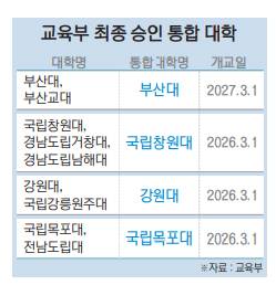 부산대학교와 부산교육대학교 통합이 정부로부터 최종 승인됐다. 양 대학은 2027년 통합 대학으로 출범하며 교명은 ‘부산대학교’로 유지된다. 국립창원대와 경남도립거창대, 경남도립남해대도 ‘국립창원대’로 통합돼 내년 3월 개교한다.