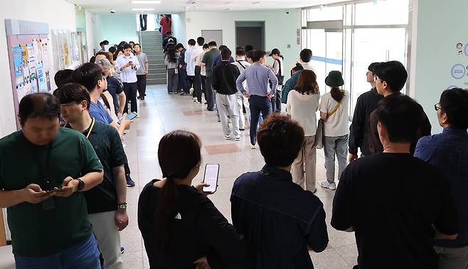 | ▲ 제21대 대통령선거 사전투표 첫날인 29일 한 사전투표소 앞에 직장인들이 점심시간을 이용해 투표하기 위해 길게 줄을 서 있다. 2025.5.29 |