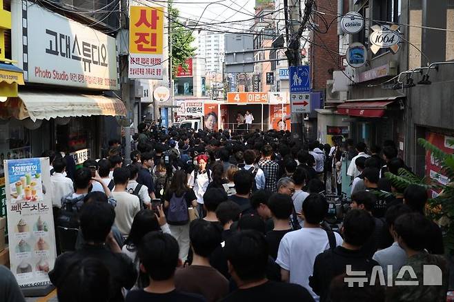 [서울=뉴시스] 조성봉 기자 = 이준석 개혁신당 대선후보가 29일 서울 성북구 고려대 정경대 후문에서 열린 유세에서 지지를 호소하고 있다. 2025.05.29. suncho21@newsis.com