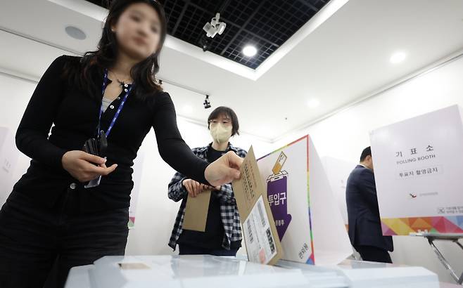[제21대 대통령 선거 사전투표 첫날인 29일 점심시간을 맞아 서울 강남구 역삼1동주민센터에 마련된 사전투표소를 찾은 유권자가 투표함에 투표용지를 넣고 있습니다. (사진=연합뉴스)]