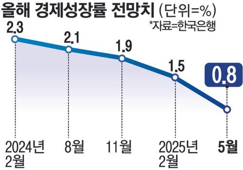 한은은 이날 기준금리를 인하하면서 올해 0%대 성장을 공식화했다. 수정 경제전망을 통해 올해 국내총생산(GDP) 성장률 전망치를 기존 1.5%에서 반 토막 수준인 0.8%로 하향 조정했다.