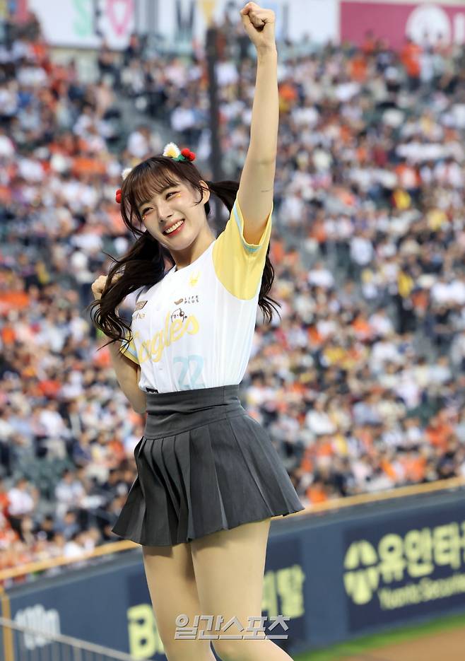 한화 치어리더 하지원이 열띤 응원을 하고 있다.