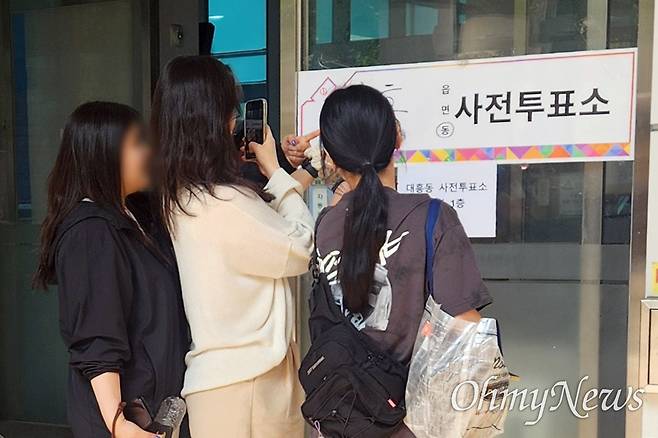 | ▲ 21대 대선 사전투표 첫날인 29일 오전, 서울 마포구 대흥동 사전투표소(대흥동 주민센터)에서 유권자들이 투표 인증 사진을 찍고 있다. |