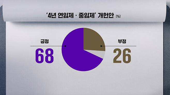 현행 5년 단임 대통령제를 4년 연임제 또는 중임제로 바꾸는 것에 대해선, 긍정 68%, 부정 26%였습니다.