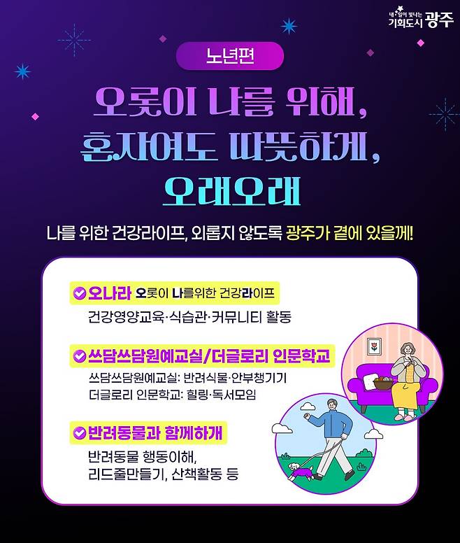 노년 1인 가구는 건강 관리와 외로움 해소 중심으로 ‘오나라’(오롯이 나를 위한 건강라이프), ‘쓰담쓰담 원예교실’, ‘더글로리 인문학교’, ‘반려동물과 함께하개’ 등 프로그램을 추진한다.