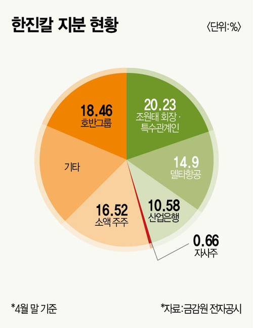 한진칼 지분 구조를 보면 조원태 회장을 비롯한 오너 일가 지분 외에도 산업은행(10.58%), 델타항공(14.9%) 등 총 45.71%가량이 한진그룹 우호 지분으로 분류된다. 아시아나항공 채권단인 산업은행은 2022년 한진칼의 제3자 배정 유상증자에 참여해 지분을 대거 확보했다. 한진칼은 이 유상증자 자금을 활용한 덕분에 아시아나항공을 품에 안을 수 있었다. 미국 항공사 델타항공 역시 대한항공과 20년 넘게 파트너십을 이어온 만큼 한진그룹 우호지분으로 분류된다.