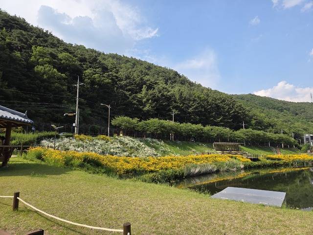 진밭골 산림공원에 샤스타데이지만 있는 것은 아니다. 대덕지 주변으로는 꽃창포도 만개해 진밭골을 노랗게 수놓고 있다. 옥선화라고도 불리는 꽃창포는 이름은 창포지만 꽃은 보라색 붓꽃을닮고, 붓꽃과식물이지만 잎줄기는창포를 닮았다. 최근 노란꽃창포 추출물에서 혈당 낮출 수 있는 효능 확인됐다는 뉴스까지 접한 터라 더 신기하고 싱그럽게 느껴진다.